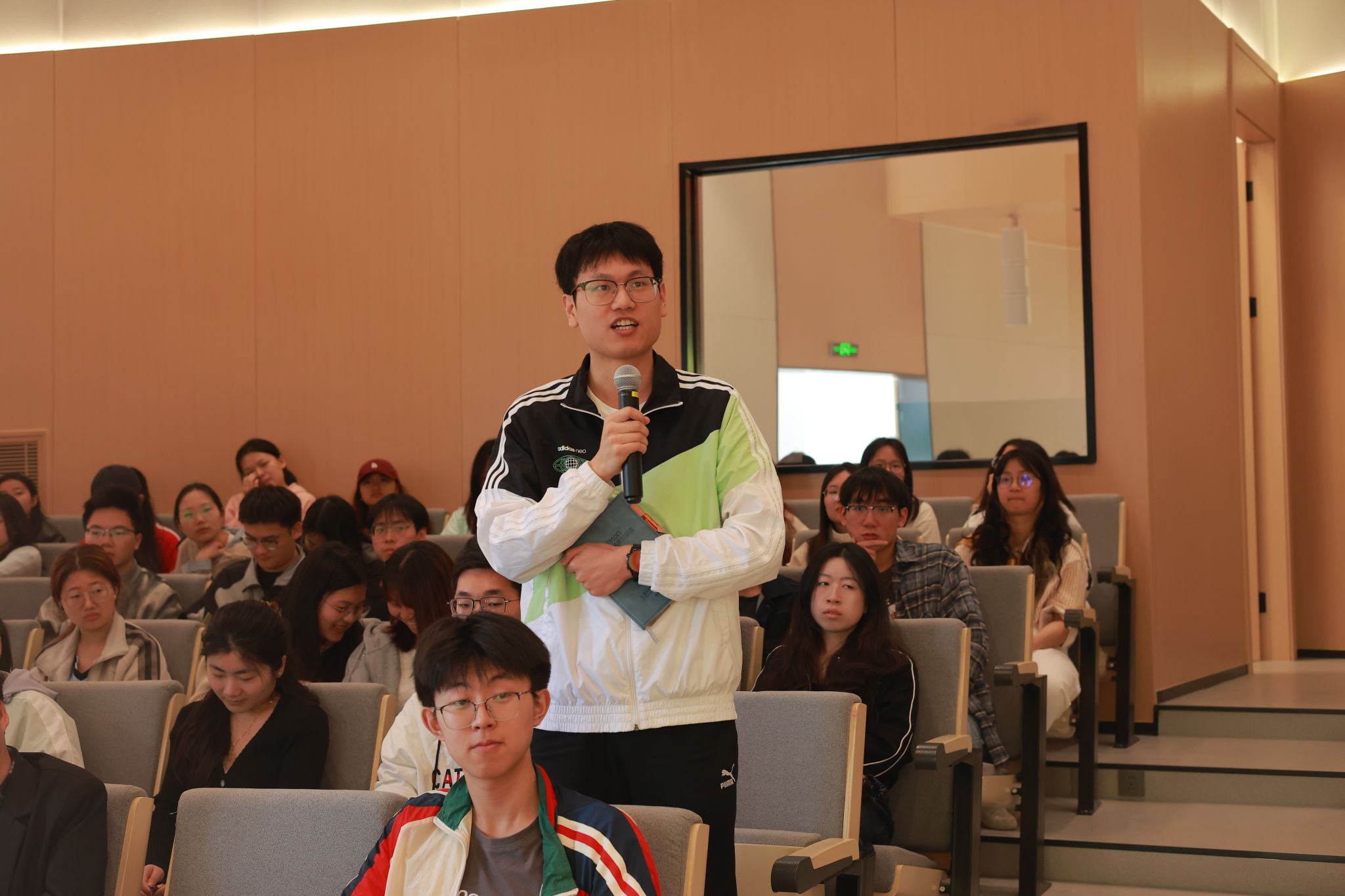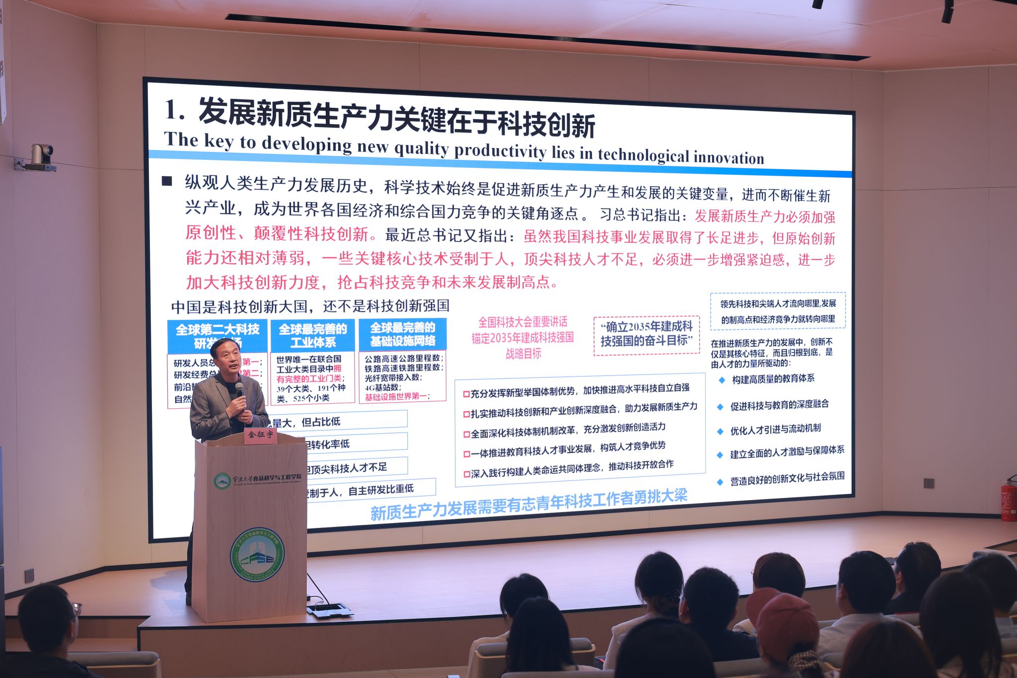 在互动交流环节,金征宇院士耐心解答同学们提出的各类问题。他语重心长地指出,我国虽已跻身科技创新大国行列,但迈向科技创新强国之路依然任重道远。他殷切寄语青年学子,要以高标准严格要求自己,勇做新质生产力发展的排头兵,为国家科技事业添砖加瓦。