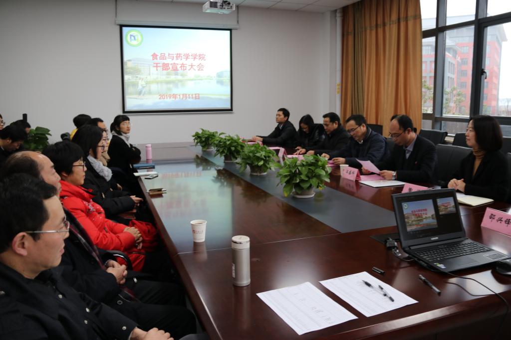 2019年1月11日上午,食品与药学学院召开干部宣布大会。校党委委员、纪委书记余建森,资产与实验室管理处处长汪盛科及学院全体教职工参加大会。会议由学院党委书记陶娟主持。