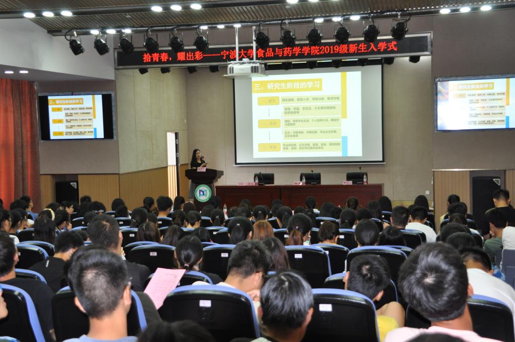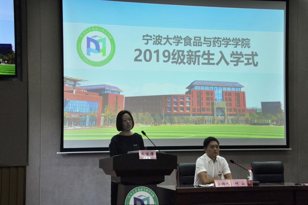 以及各专业基本情况。邵院长鼓励同学们科学规划、紧抓机遇,明确发展方向;务实肯干、主动思考,珍惜学习机会;勇于挑战、大胆质疑,提升创新能力。会上,老生代表2017级食品科学专业硕士吴燕结合自身求学经历从专业认知、大学规划等方面为同学们介绍期待中的大学生活,同时建议同学们学好英语,珍惜时间,脚踏实地。2019级食品科学与工程专业1班本科生袁天浩作为新生代表发言,畅谈对大学的憧憬,对温暖宁大的感动与热爱。随后,陶娟书记讲话,她对2019级同学提出了几许期望,希望他们要以终为始,鸿鹄志与小目标相结合,一步一印不断前进;要以勤为径,会学习与能创新相结合,一朝一夕不懈奋斗;要以德为先,明大德与严私德相结合,一言一行涵养品格。其后会议第一阶段的戴院徽,唱校歌环节将整个入学式推向高潮。