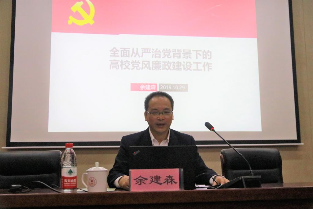 余建森书记首先结合全面从严治党的提出与重大意义、纪检监察体制机制改革,解读了全面从严治党新部署新要求;然后通过对教育系统从严治党存在的问题和典型案例的分析,介绍了目前高校全面从严治党、党风廉政建设和反腐败形势;最后,对学院党风廉政建设工作提出了三点要求:一是认真履行党委的主体责任和纪委的监督责任;二是完善内部治理结构,健全工作制度;三是完善党风廉政建设情况分析会制度。