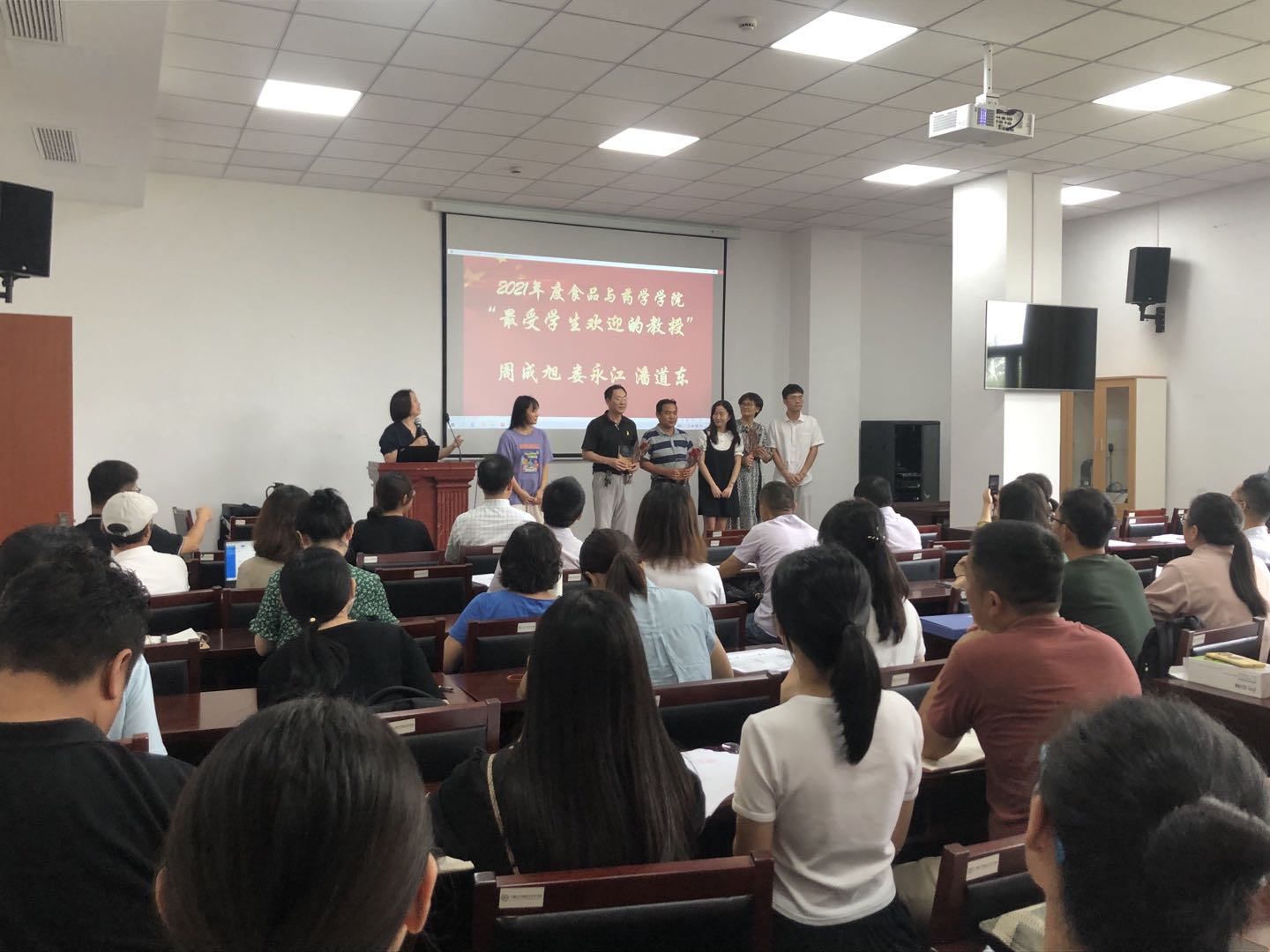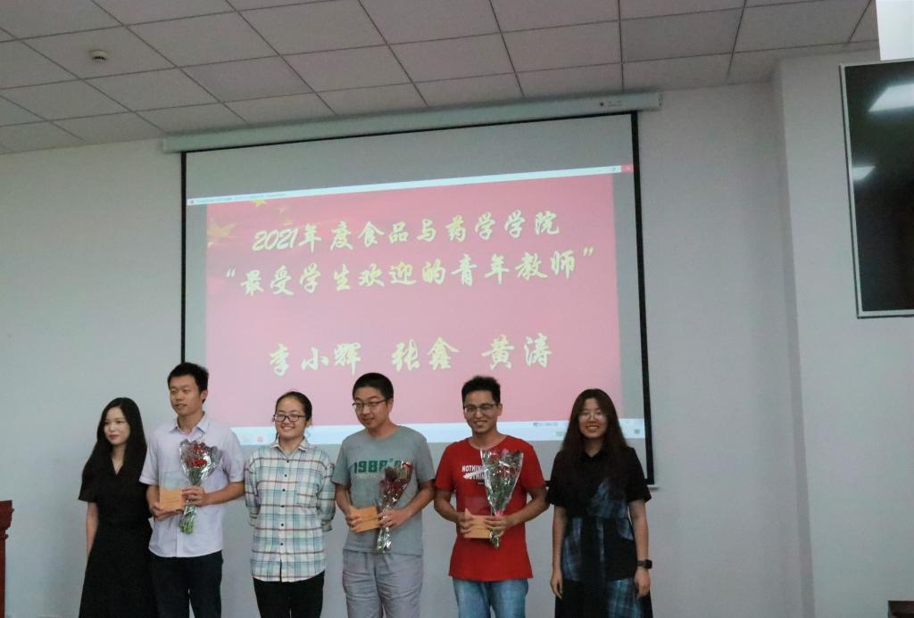 会上,陶娟宣读2021年“最美食药人”获奖名单,由院优秀学生代表为获奖教师进行颁奖。本次共评选出学院“最受学生欢迎的教授”3人,“最美导师”3人,“最受学生欢迎的青年教师”3人,“最美服务之星”1人。会上,还对获得学校“最美宁大人”、“最受师生喜爱的书记”、“优秀共产党员”、“优秀党务工作者”、各级省市人才称号及科研奖项的老师们进行了表彰。