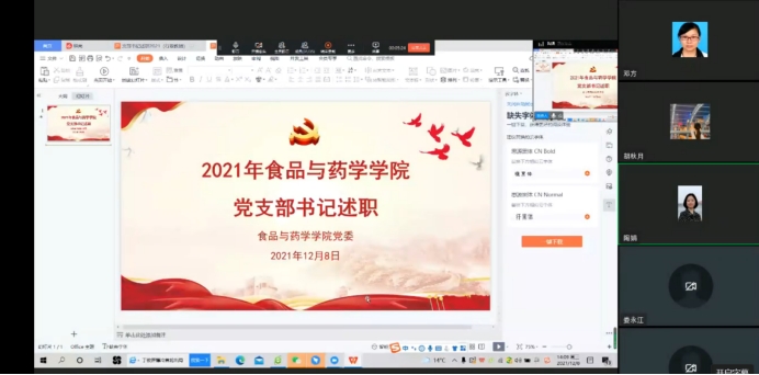 12月8日下午,食品与药学学院召开2021年度学院党支部书记抓党建述职汇报会,受疫情影响,本次汇报会采用线上方式进行。学院党委委员、各党支部书记、支委委员、专职组织员等30余名党务工作者参会。会议由学院党委书记陶娟主持。