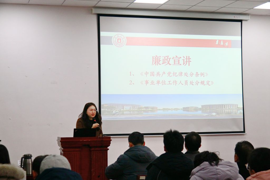 学院党委副书记、纪委书记谢果凰对《中国共产党纪律处分条例》和《事业单位工作人员处分规定》内容依次进行了宣讲。针对新修订的《中国共产党纪律处分条例》的修订内容进行解读,她指出我们要深刻领会《中国共产党纪律处分条例》的主要内容和精神实质,从党章这个总源头出发,全面贯彻习近平新时代中国特色社会主义思想和党的二十大精神,进一步严明政治纪律和政治规矩。《事业单位工作人员处分规定》于23年11月份出台,本次重点学习《规定》违法违纪行为及其适用的处分、处分的权限和程序等方面内容。通过本次宣讲会进一步强化学院党风廉政建设工作力度,提高全体教职工遵纪守法意识。