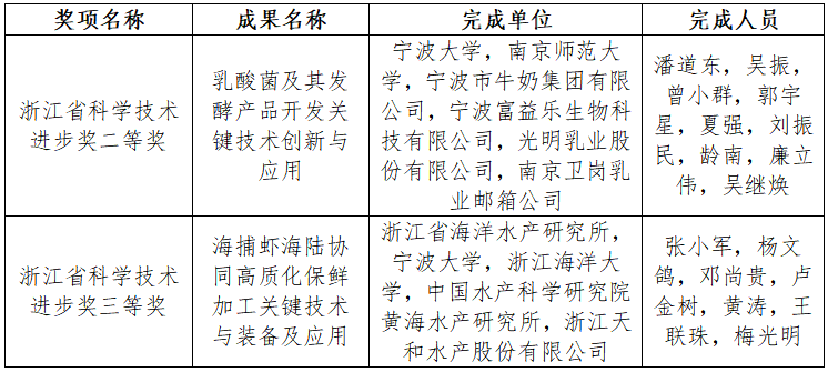 2024年11月22日上午,加快建设创新浙江因地制宜发展新质生产力动员部署会暨全省科学技术奖励大会在杭州举行。大会表彰了2023年度浙江省科学技术奖,其中黑料 潘道东教授主持完成的“乳酸菌及其发酵产品开发关键技术创新与应用”荣获浙江省科学技术进步奖二等奖,杨文鸽教授(第二单位)参与的“海捕虾海陆协同高质化保鲜加工关键技术与装备及应用”荣获浙江省科学技术进步奖三等奖。