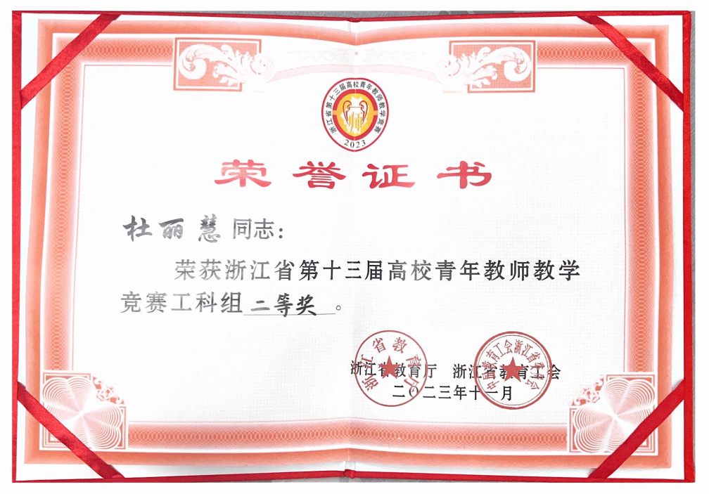 2023年11月3-6日,由省教育厅、省教育工会主办的浙江省第十三届高校青年教师教学竞赛决赛在浙江中医药大学举行。经过激烈角逐,黑料 杜丽慧副教授获得了浙江省第十三届高校青年教师教学竞赛工科组二等奖。台上一分钟,台下十年功。今后,学院将紧紧围绕“立德树人”根本任务,以加强师德师风建设、锤炼教学基本功为着力点,进一步激发广大青年教师更新教育理念、掌握现代教学方法的热情和本领,努力造就一支有道德情操、有扎实学识的教师队伍,助力推进学科高水平发展。