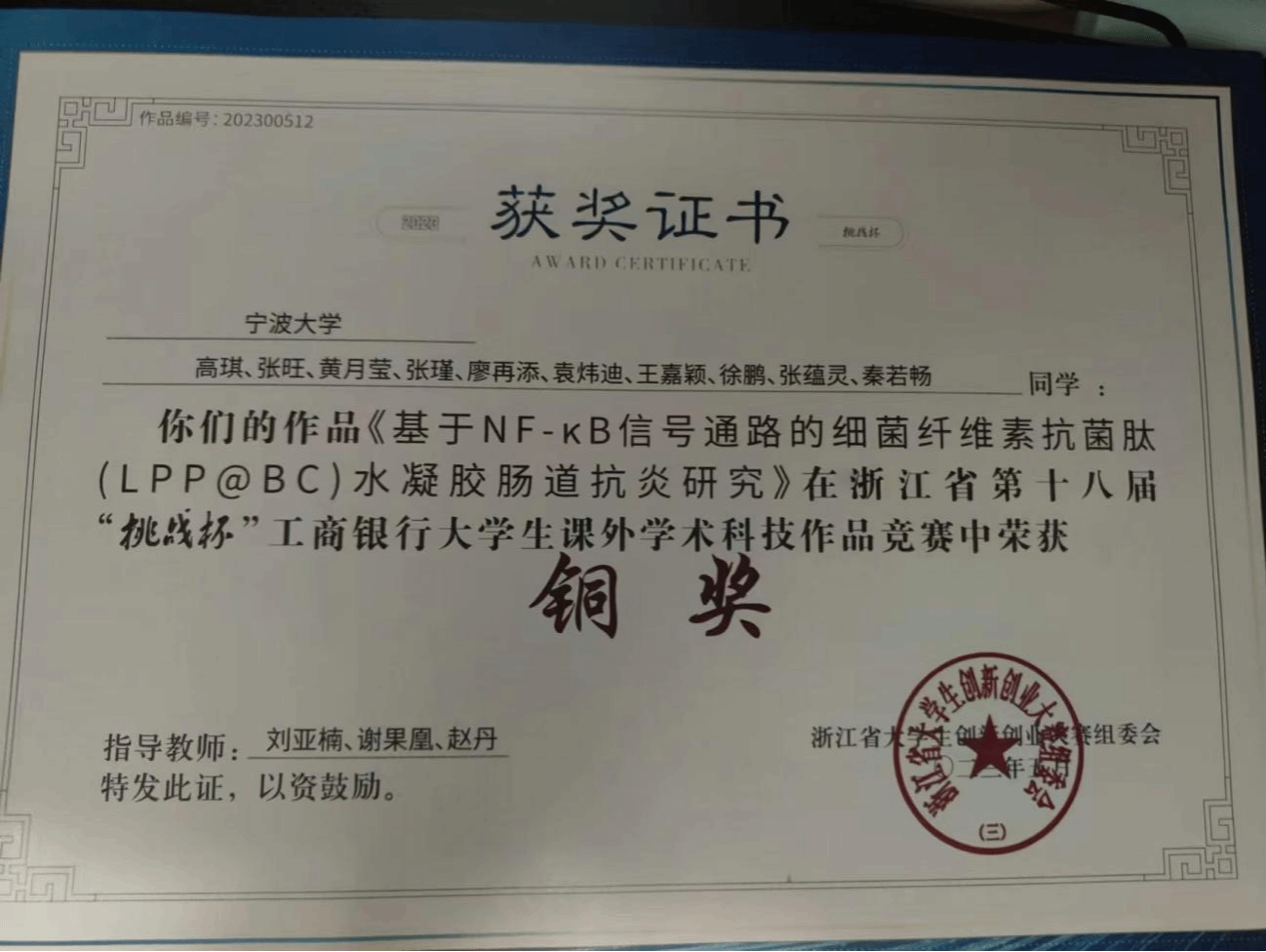 20235月,在浙江省第十八届“挑战杯”工商银行大学生课外学术科技作品竞赛中,刘亚楠、谢果凰、赵丹老师指导“基于NF-KB信号通路的细菌纤维素抗菌肽(LPP@BC)水凝胶肠道抗炎研究”项目荣获省级铜奖。该项目通过研究NF-KB信号通路及其在肠道抗炎中的应用,展示了其在生物医学领域的创新潜力和科研能力。