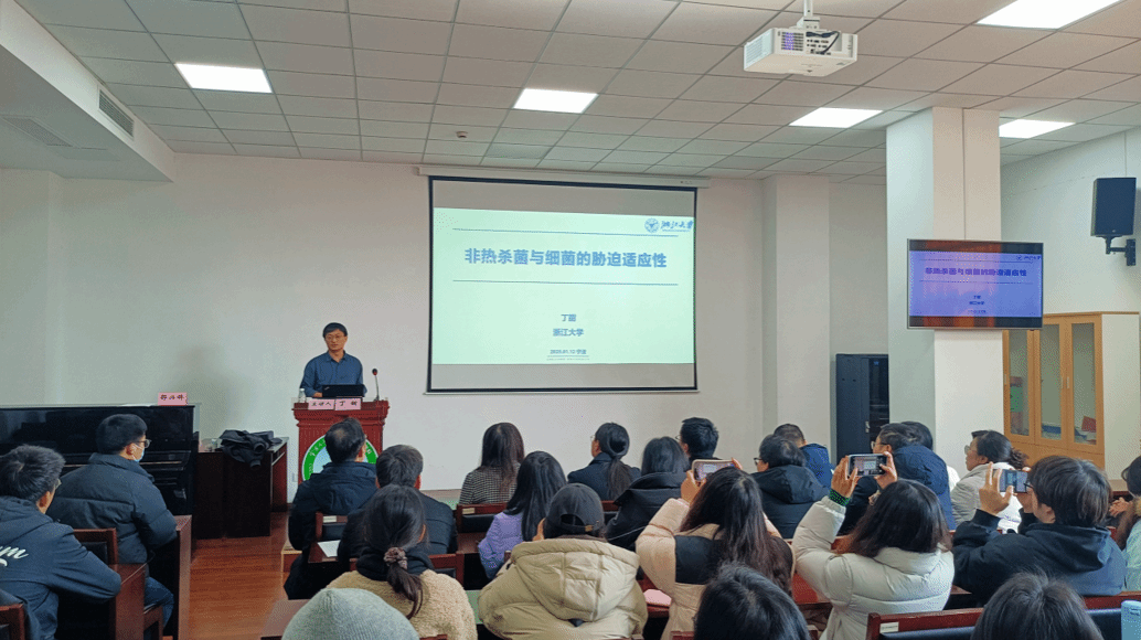 指导并作了题为《非热杀菌与细菌的胁迫适应性》的学术讲座。学院执行院长邵兴锋教授主持讲座,学院教师和研究生共80余人参加了此次讲座。