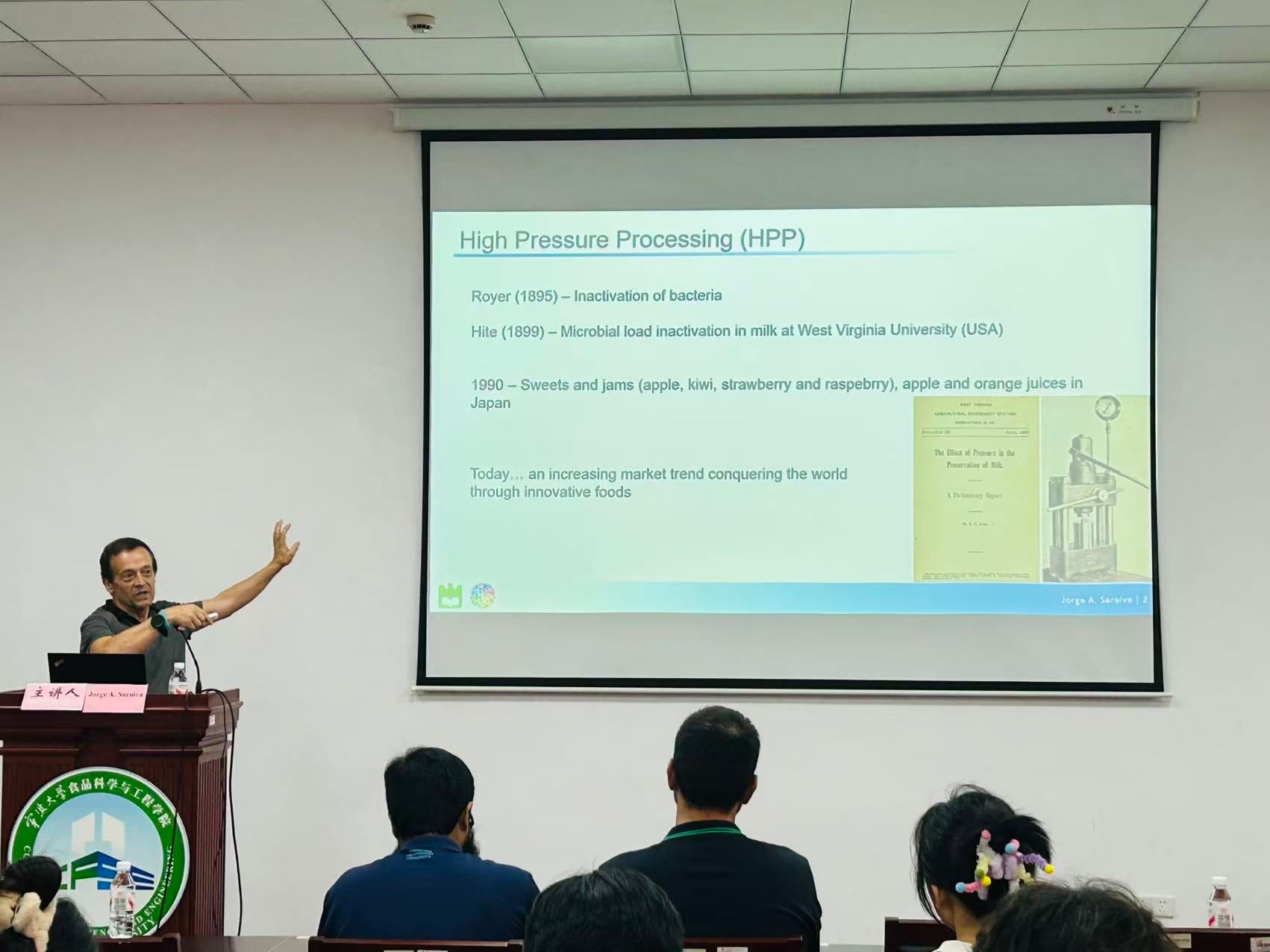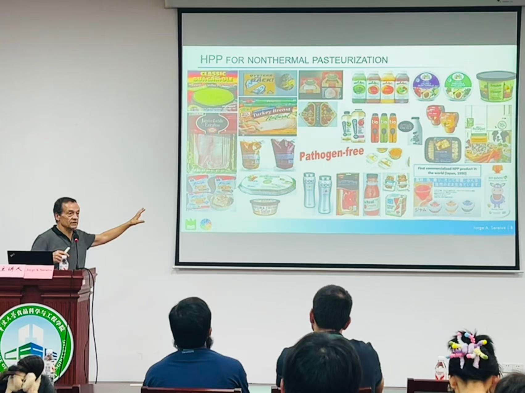 此次讲座,Saraiva教授聚焦高压加工(HPP)技术在食品非热杀菌、高压存储及生物技术的应用。他指出,高压加工(HPP)技术基于等静压原理,可快速均匀传递压力,不受食品形态和包装限制,在食品加工中实现“无差别处理”。该技术已广泛应用于果汁、肉制品等食品加工领域,能保留生鲜属性并延长货架期。在存储方面,室温高压存储可替代传统冷藏,显著降低能耗与碳排放;“散装HPP”技术提升了生产灵活性,为工业化应用奠定基础。此外,HPP技术还跨界应用于生物技术领域,通过改变蛋白质折叠结构助力药物研发和无化学残留疫苗生产。Saraiva教授强调,高压技术是食品产业升级与生物领域创新的关键引擎,在食品非热加工、绿色存储及生物医药跨界融合中,具备"新产品开发、工艺革新、经济增值"的广阔潜力。