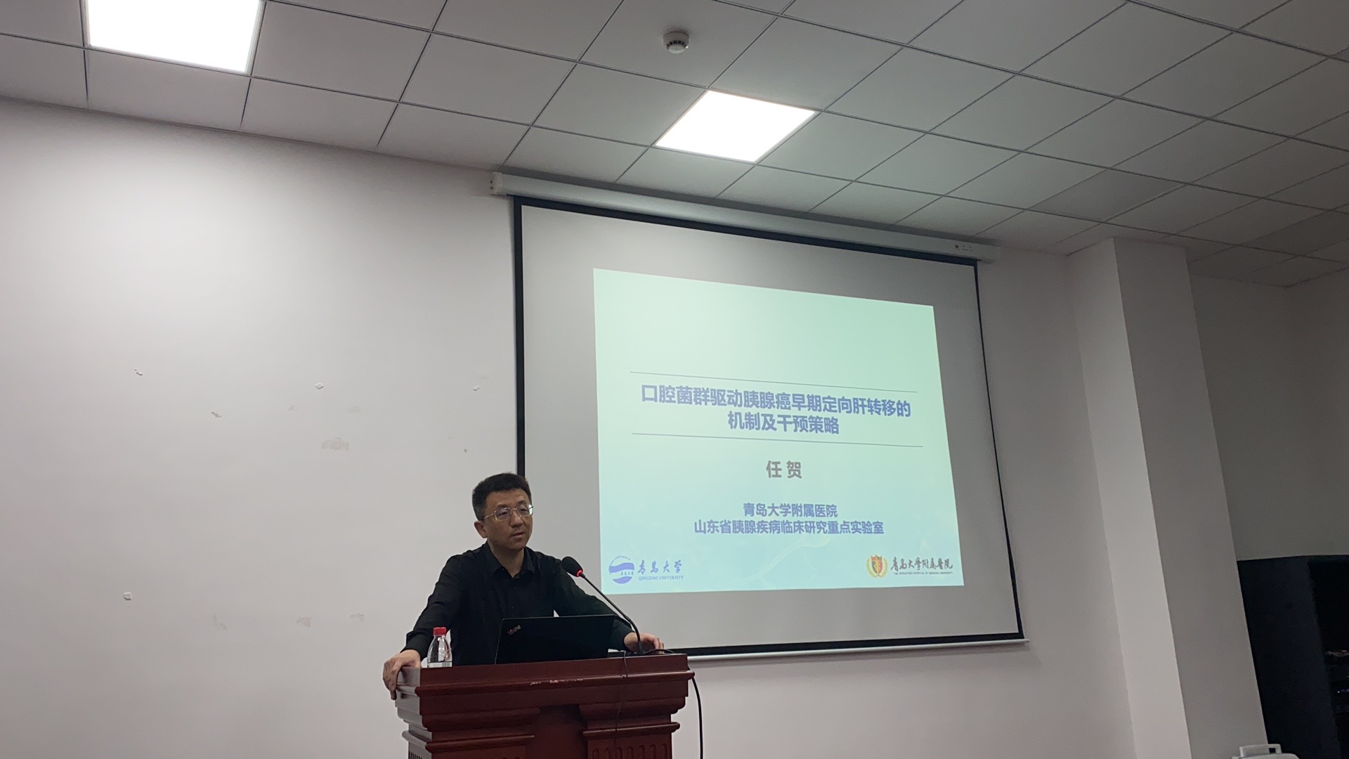 师生做题为《口腔菌群驱动胰腺癌早期定向肝转移的机制及干预策略》的学术报告。参与报告会的主要为食药学院教师和研究生,执行院长邵兴锋主持了报告会。