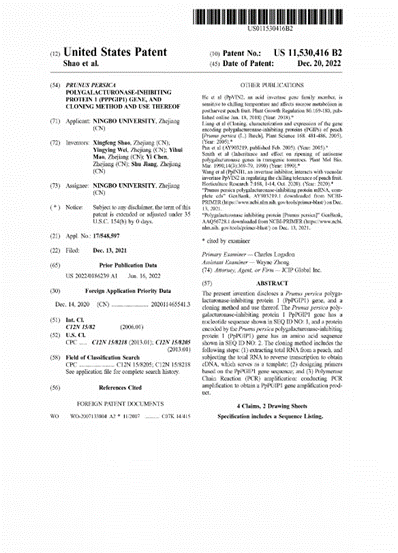 邵兴锋教授团队申请的发明专利“PRUNUS PERSICA POLYGALACTURONASE-INHIBITING PROTEIN PpPGIP1 GENE, AND CLONING METHOD AND USE THEREOF”,近日获得美国专利及商标局授权,授权证书号US11530416B2。