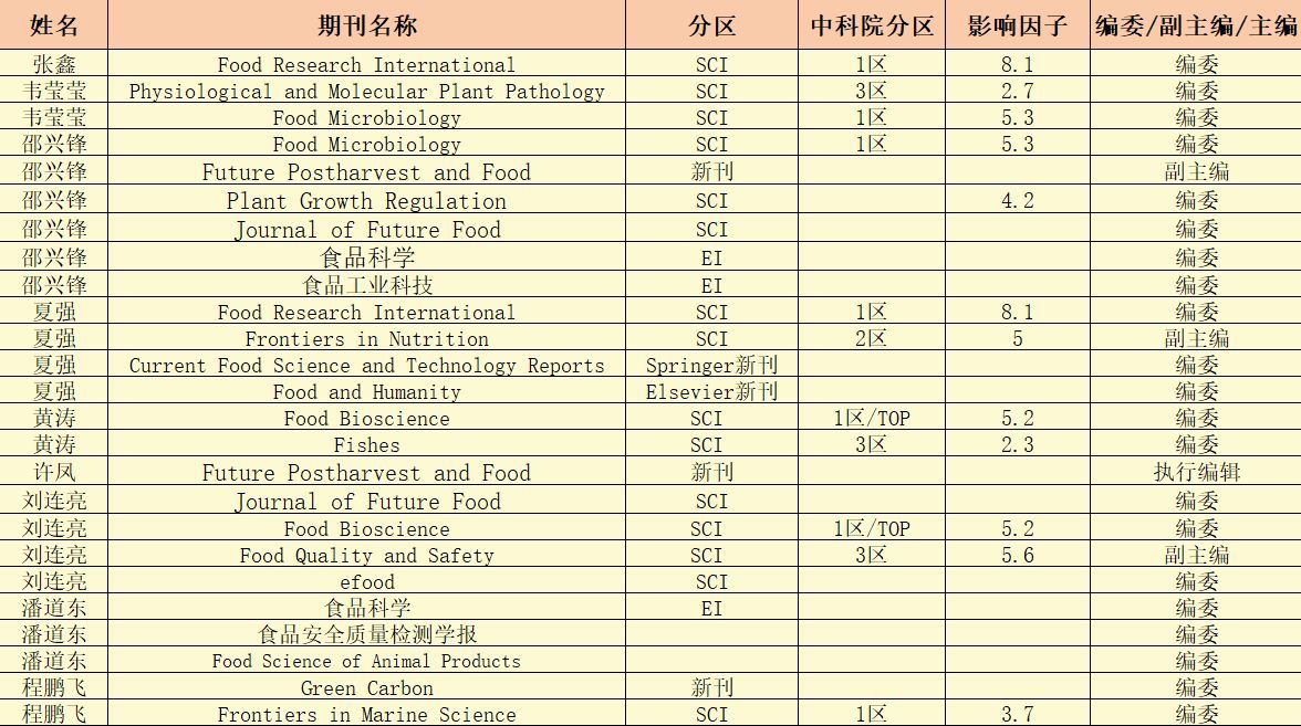多位教师在国内外权威学术期刊兼任执行主编、副主编和编委等工作,共同致力于推动食品科学研究的高质量发展。具体任职情况如下:
