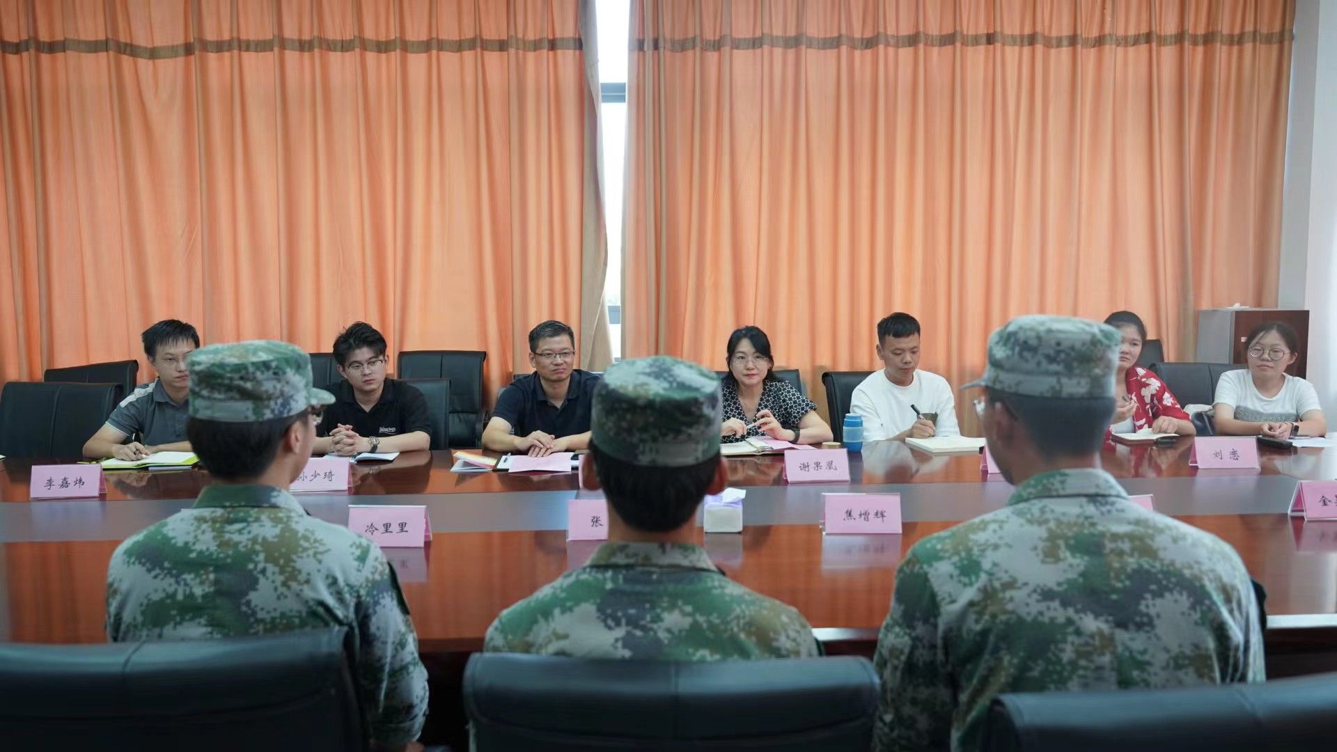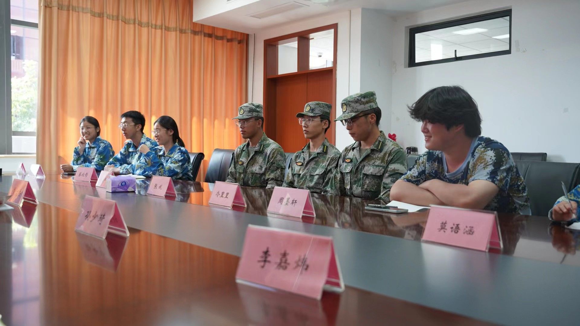学院领导与军训教官、参训新生代表深入交流,耐心倾听学生诉求,了解参训学生训练、生活适应情况,对同学们奋发向上、努力拼搏的精神状态给予充分肯定,鼓励同学们继续发扬不怕苦、不怕累的精神,以更饱满的热情和更顽强的斗志投入到军事训练中,圆满完成各项军训任务。领导们还逐一听取了各承训教官的军训情况汇报,对教官的辛勤付出表示衷心感谢,并为他们送上了解暑饮品。
