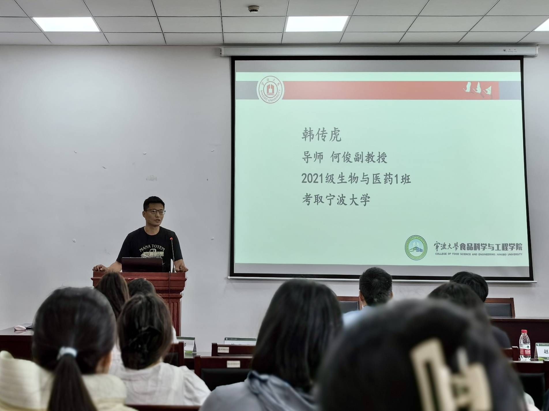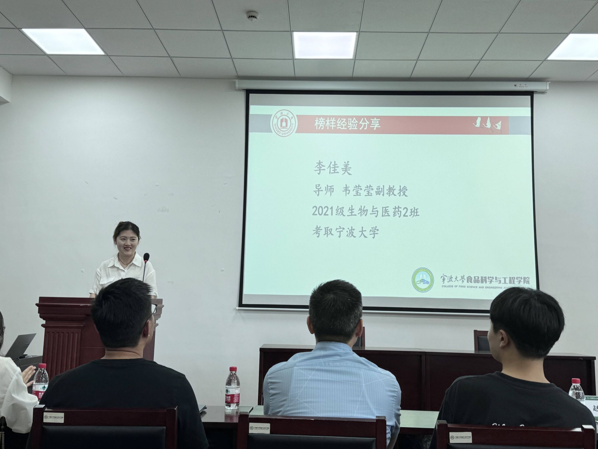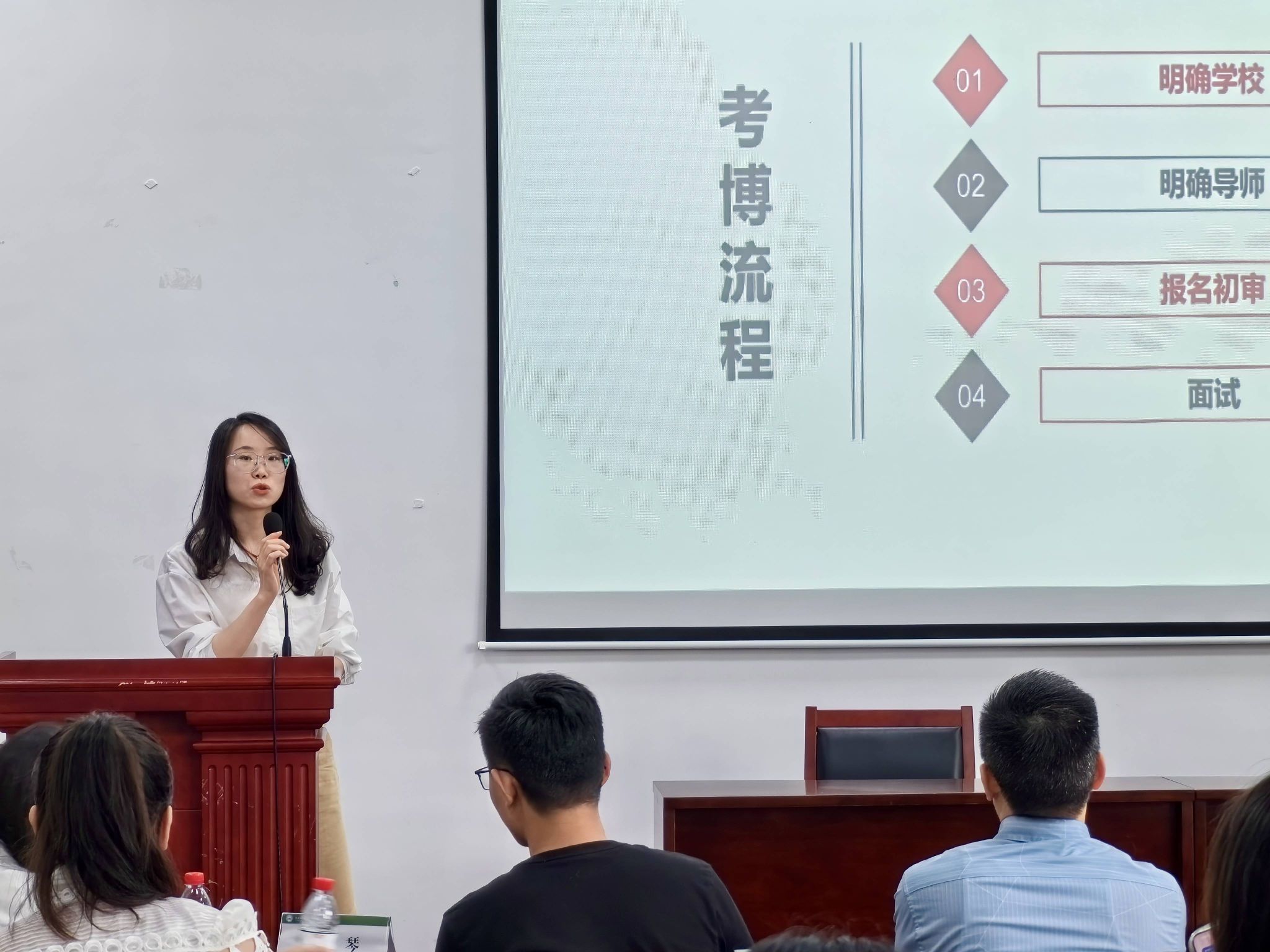交流会伊始,阮怡清老师简要介绍了到场的嘉宾,并代表学院致以热烈的欢迎。随后,陈琴、韩传虎、山圣洲、赵子畅、李佳美五位已经考取博士的同学依次上台,结合个人考博经历,分享了宝贵的备考经验和备考建议。他们分别从申博流程、考试内容、面试技巧、学校和导师的选择等多个方面进行了深入剖析,为正处于未来道路抉择的同学们点亮了一盏明灯。