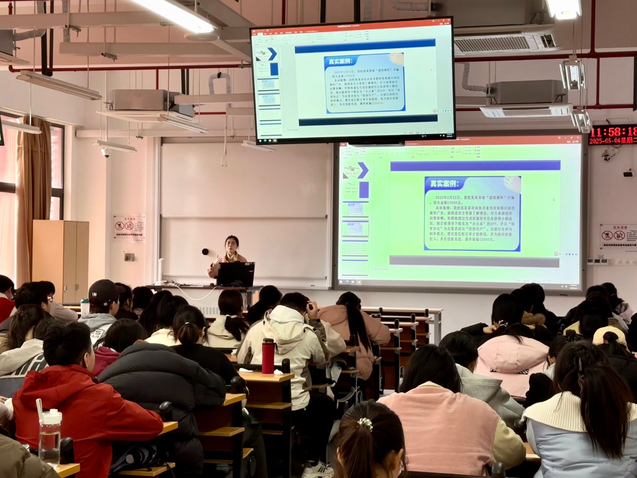本次宣讲以大学生身边的真实诈骗案例为切入点,如冒充公检法人员诈骗、网购退款陷阱、兼职刷单骗局等,深入剖析了新型诈骗类型与操作方式,强调不轻信、不透露、不转账的重要性,警示同学们时刻保持警惕。同时,鼓励大家下载国家反诈中心APP,为自己穿上防骗盔甲