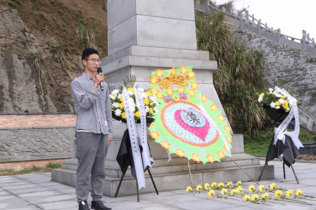在革命烈士纪念碑前,青年们瞻仰、献花、致辞、默哀。阳光下的革命烈士纪念碑庄严肃穆,碑前肃立的青年学子震撼且感动。这块方土地上,仅有两名烈士留有姓名,其余的只留下一个数字,一面空碑,一段经历。曾经他们应该如今日的青年一样神采奕奕,如今日的阳光一般灿烂明亮,但他们为保护梅山牺牲了自己。本科生党支部书记张恒作为党员代表发言。