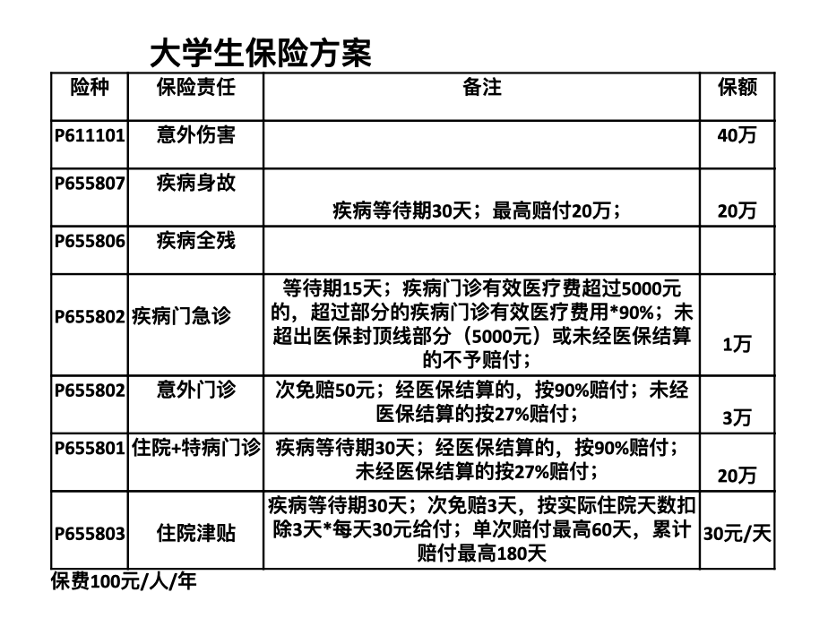 保险公司根据往年学生参保及保险赔付情况,制定了2025-2026学年的学生平安险方案,具体包括的险种以及最高金额如下: